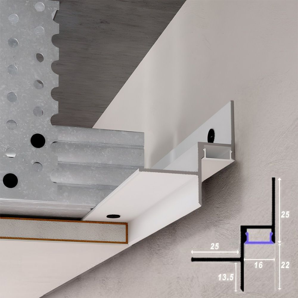 Longitudes 1500, 2000, 3000 mm (se calcula por separado), distancia entre pared y techo 16 mm, RAL 9016 (blanco). El perfil de sombra LED permite la instalación rápida y sencilla de los paneles de cartón yeso, creando un efecto original de techo flotante y sirviendo también como fuente de iluminación adicional. La instalación de la tira LED y del difusor debe realizarse antes de fijar las placas de cartón yeso y de conectar el perfil LED con los perfiles principales/pared.