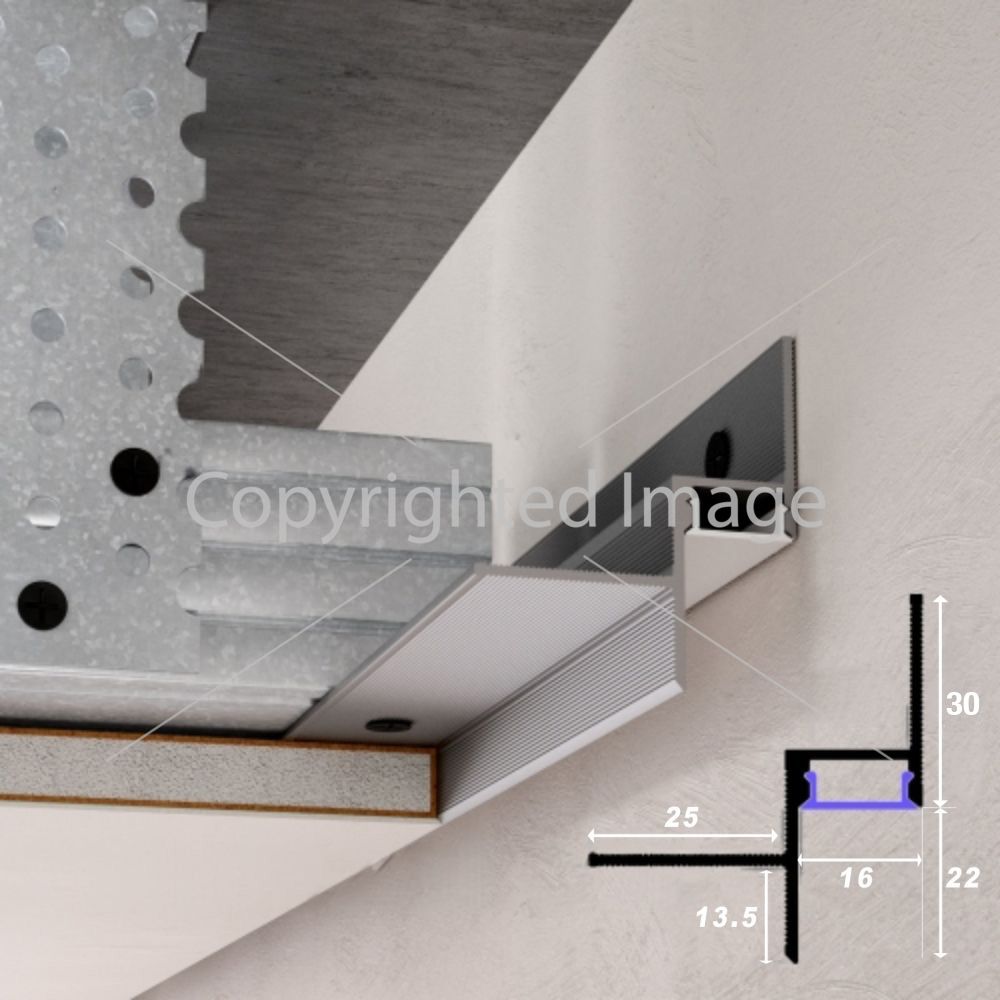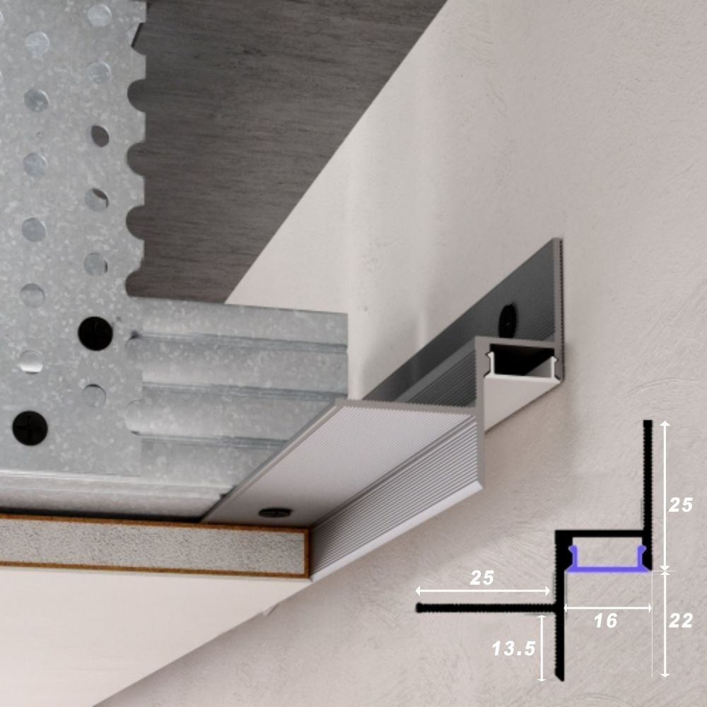 Longitudes 1500, 2000, 3000 mm (se calcula por separado), distancia entre pared y techo 16 mm. El perfil de sombra LED permite la instalación rápida y sencilla de los paneles de cartón yeso, creando un efecto original de techo flotante y sirviendo también como fuente de iluminación adicional. La instalación de la tira LED y del difusor debe realizarse antes de fijar las placas de cartón yeso y de conectar el perfil LED con los perfiles principales/pared.