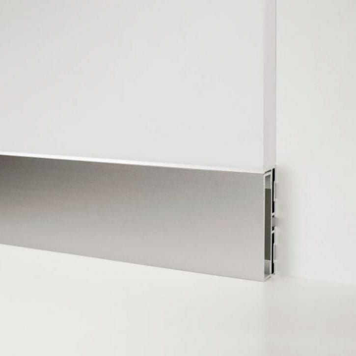 Profil dreptunghiular din aluminiu, grunduit, pregătit pentru vopsire manuală cu vopsea acrilică împreună cu peretele. Poate fi folosit ca inserție pentru plinta ascunsă de 60 mm lățime sau ca plintă exterioară separată. Este disponibilă vopsirea la comandă în culori RAL.